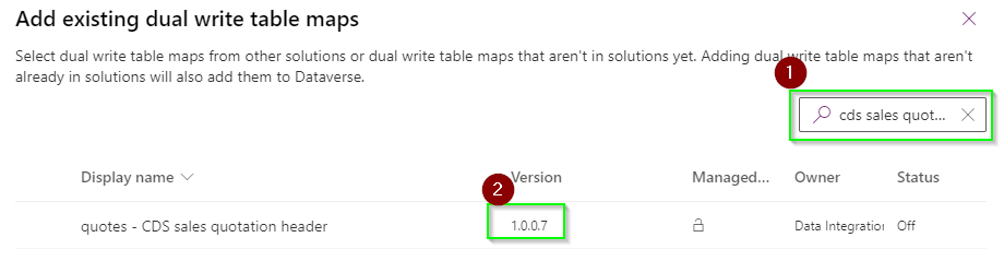 From the Add existing dual write table maps screen, search for the table mapping name and then select the right mapping and click Add.