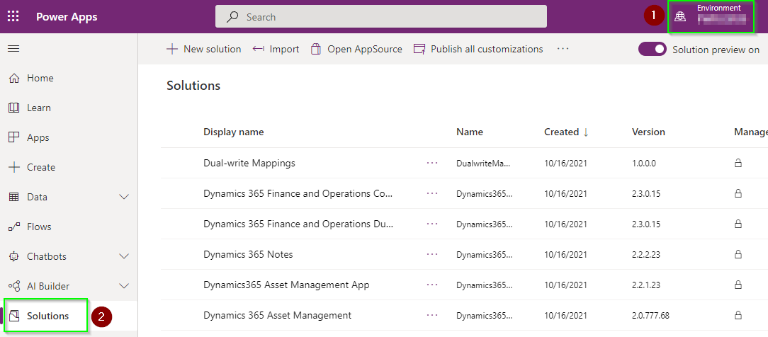 Navigate to https://make.powerapps.com. From the top right-hand side corner choose the right Environment and go to the Solutions tab.